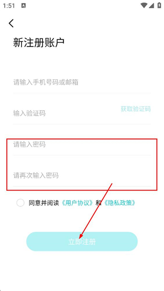 4、在新注册账户页面,继续填写输入密码和再次输入密码,点击立即注册,完成思特云联账号的注册流程。