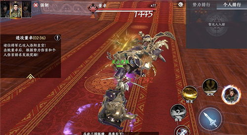 极无双2第三关为洛阳皇宫,这一关需要挑战BOSS董卓,同时会根据势力伤害、个人伤害进行排名,发放奖励。
