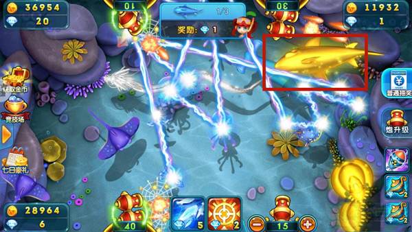 3、当某条大鱼出现,玩家可以使用锁定道具,将大鱼设为目标之后,再加上极速,这样炮弹的发射速度变得更快,抓到大鱼的几率越大。
