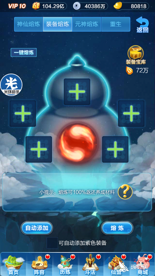 3、紫金凝神(只有幻彩以上品质才有):消耗任意的紫金元神碎片,紫金凝神提升全体上阵神仙属性
