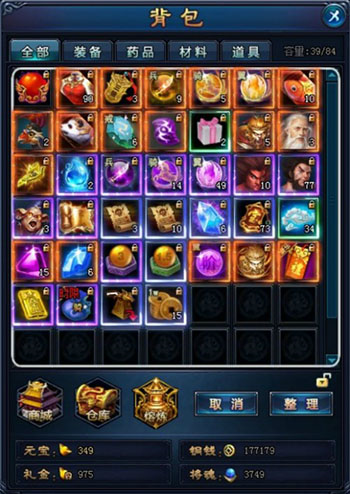 点击【整理】按钮,物品会按需自动排列,重复的道具会自动叠加。