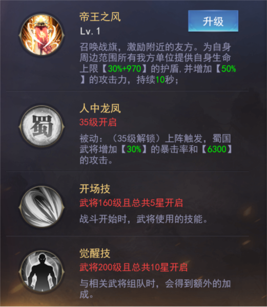 刘备作为刀兵其属性更像是一个辅助,前期通过技能给友方增加生命上限和提供护盾和攻击力,35级后解锁给自己蜀国武将增加攻击力和暴击率,帮助蜀国武将提供一个质的飞跃~