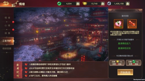 进入副本后,需要守护三生石,会有14波怪物进攻考验,并在守护三生石过程中接受4次“默契大考验”,若在规定时间内双方选择的物品一致,则会增加“心有灵犀”次数,最终在副本结束时根据心有灵犀次数来获得不同档次的副本奖励。