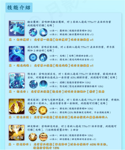5、神龙降世:可开局第3回合施放,伤害最高的群攻技,也可根据敌方血量在残血时一举收割。