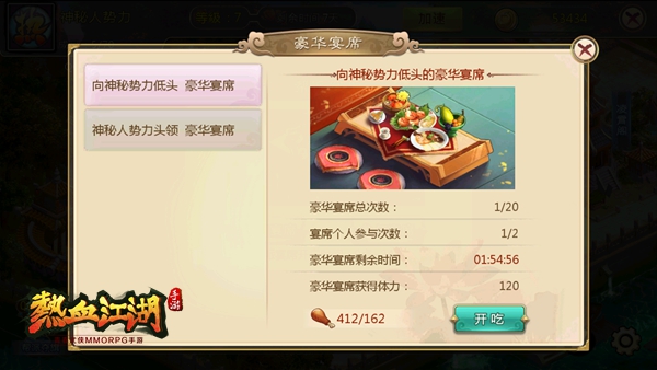 在帮派宴客厅中,帮众可以开启宴席来为其他同僚提供体力。普通宴席可以提供60点体力,豪华宴席则可以提供120点体力。记得每天开启和参加宴席也是获取体力的重要方式之一!