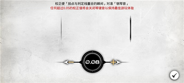 4、通过点击古树旋律古树旋律“-”和“+”进行校正,使拍点与判定线重合的瞬间对准钢琴音;调整完成后点击右下角的“√”;