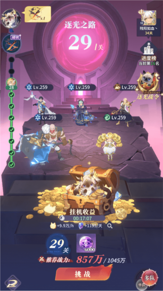 逐光之路是游戏中最重要的pve副本,关系到每天资源获取的进度,因此每天都要尽量打到打不动为止,每日挂机加速次数拉满,获取丰富面包、金币和突破石奖励
