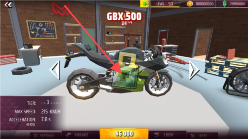 1、在车库界面,可查看摩托车如【GBX 500】的属性,花费$6000购买,为比赛或冒险做准备。