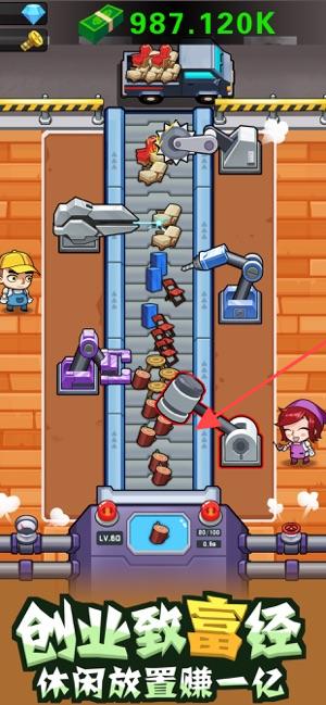 3、创业致富经玩法,画面中有工厂流水线,通过机械臂等元素体现休闲放置赚钱的模式。