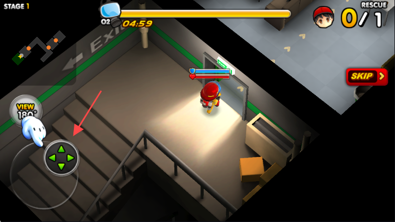 2、在游戏场景中,通过左下角箭头所指的绿色虚拟摇杆控制角色移动,探索场景。