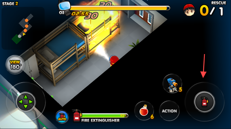 3、遇到火灾时,点击右下角箭头所指的灭火器图标,使用灭火器进行灭火操作,完成救援任务。