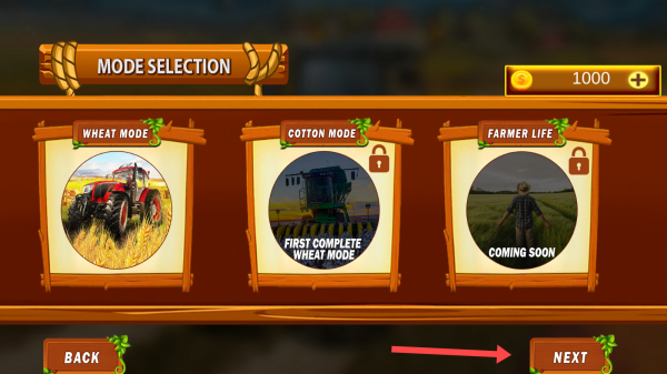 2、在模式选择界面,选择【箭头】所指的“WHEATMODE”(小麦模式)后,点击【NEXT】按钮,进入下一步。