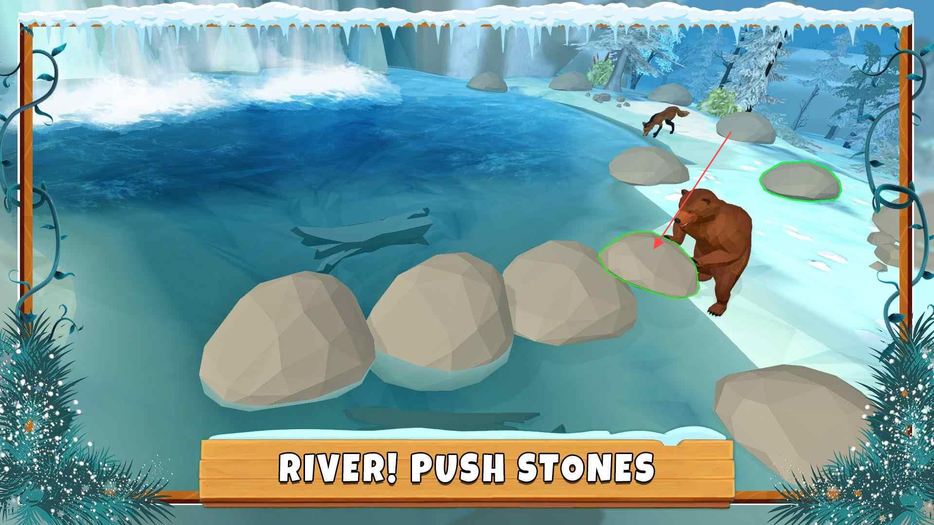 3、于河边让棕熊进行【PUSHSTONES】操作,推动石头完成相应游戏任务目标。
