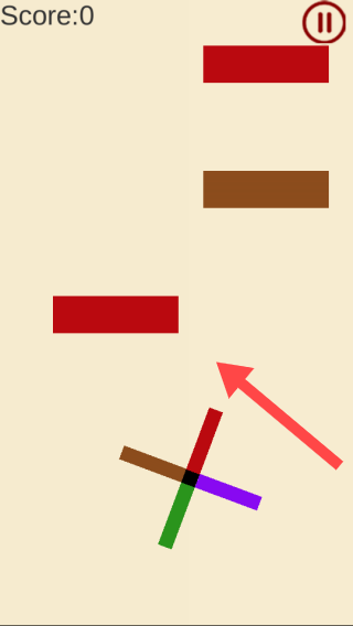 1、基础旋转操作技巧:点击屏幕旋转彩棒调整端点颜色,观察砖块排列顺序,优先处理连锁反应色块,提升消除效率与得分。