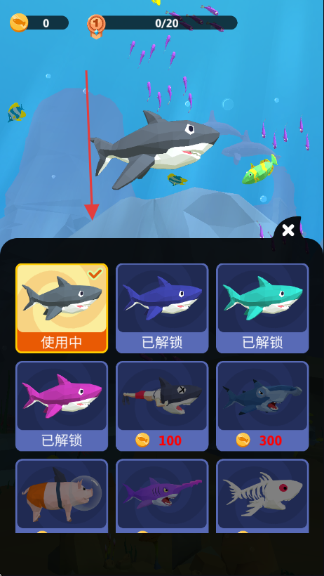2、在【皮肤】界面可选择已解锁的鲨鱼外观,更换个性化的鲨鱼皮肤。