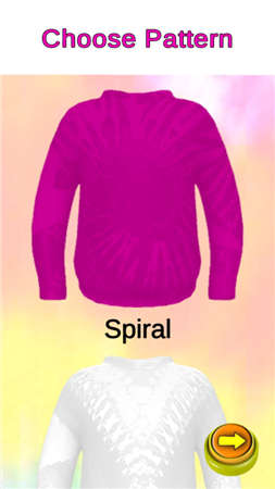 3、在选择界面如【Spiral】等图案样式,点击黄色箭头按钮,应用图案到衣物上完成设计。