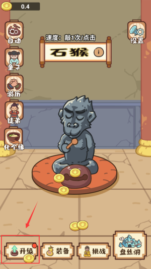 2、敲击石猴会掉落的金币,点击左下角升级。