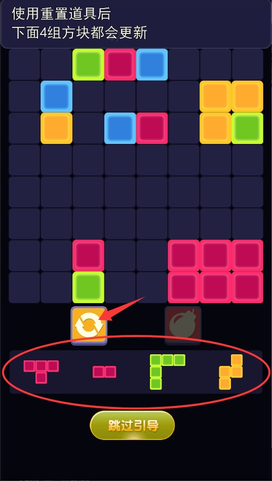 3、当局面陷入僵局时,点击刷新按钮重置下方待选方块,获得新的组合机会继续完成消除挑战。