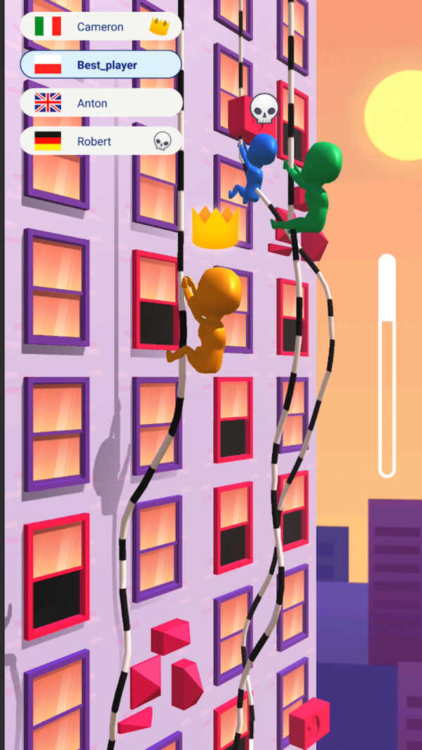 3、干扰与防御:通过滑动屏幕投掷物品干扰对手,同时注意观察上方坠落物轨迹,及时横向移动躲避,保障自身攀爬安全。