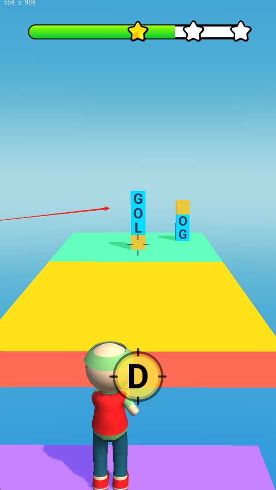 1、进入游戏后,观察单词塔上呈现的残缺单词,滑动屏幕调整小人视角,确定字母的发射瞄准点,屏幕上的准星能辅助玩家精准定位。
