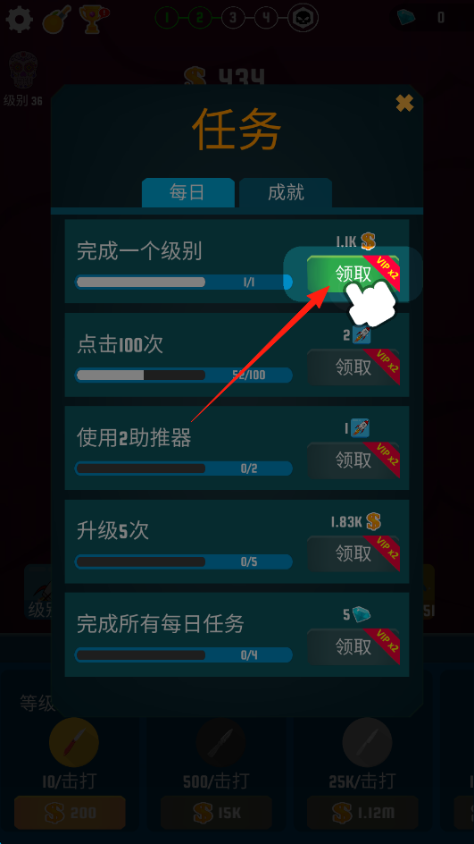 2、完成级别后,进入任务界面,领取奖励,积累金币,用于升级刀具。