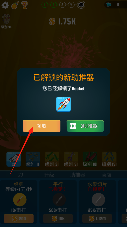 3、解锁新助推器,点击领取,使用助推器,助力扔刀,挑战更高难度。