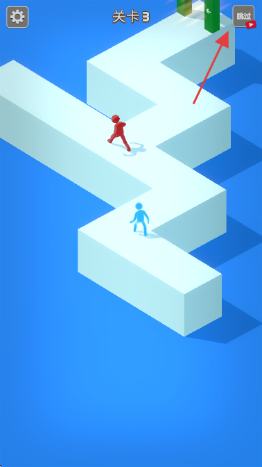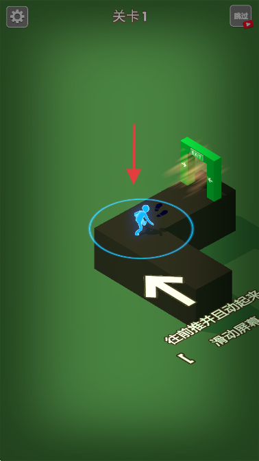 3、关卡3中,操控蓝色角色规避红色敌人,沿路径向箭头所指绿色门逃亡,可以点击箭头指的位置跳过这关。