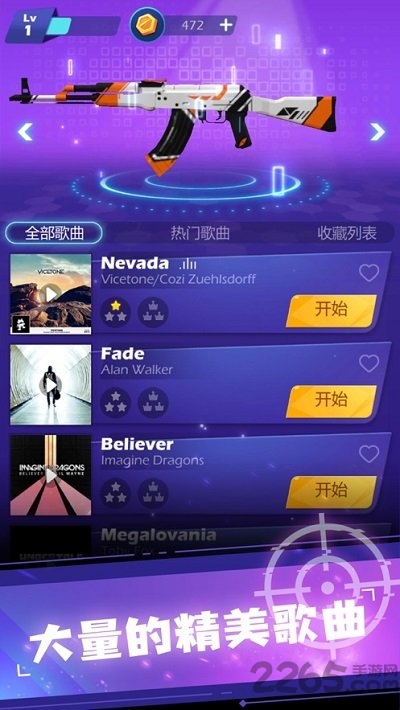 4、健康游戏环境无氪金压力。每首歌曲都配有专属设计的射击轨道。所有内容均可通过游戏内成就解锁,技术才是决定分数的关键因素。