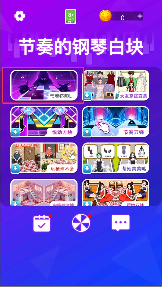 1、基础演奏模式。琴键会随着音乐节奏从上方落下,在合适时机点击即可得分。连续准确点击可以触发连击效果,获得更高分数。
