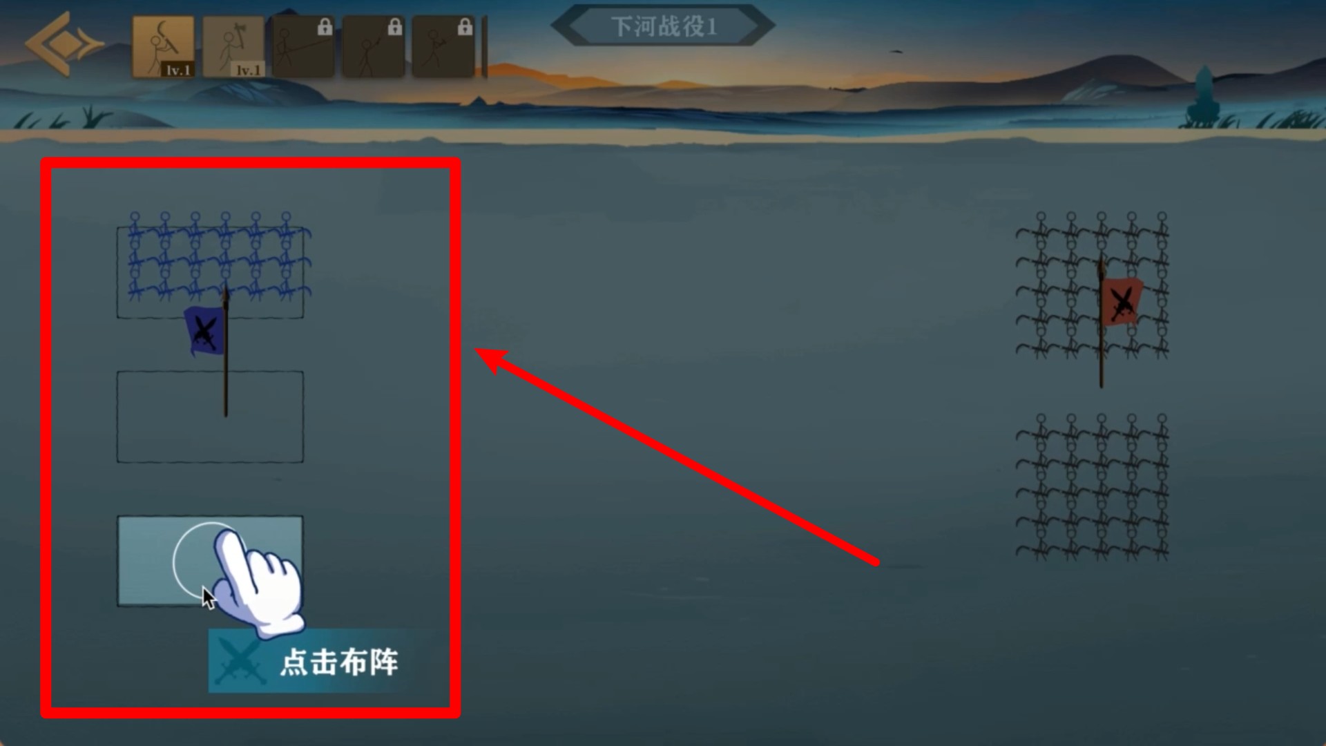 2.点击布阵按钮,进入战场阵型设置界面,规划士兵站位以应对敌军布局变化。