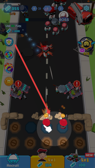 2、在战场上长按并拖动两个相同等级的士兵重叠,触发合成机制,升级为更高星级的强力士兵。