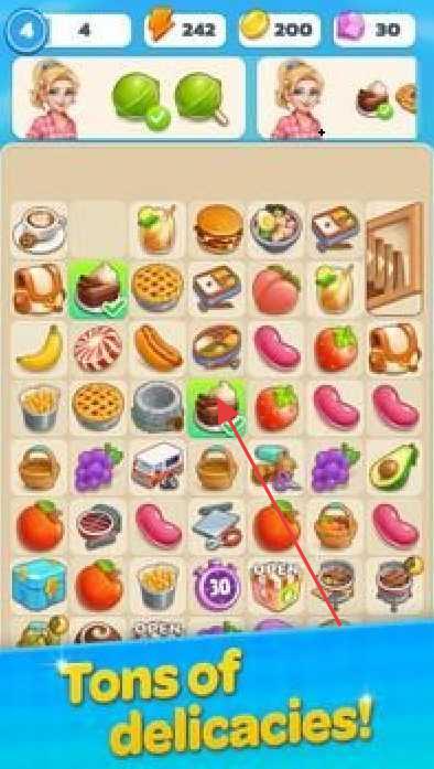 2、在美食界面,收集“Tons of delicacies”(各类美食),匹配订单需求,完成交易获取资源。