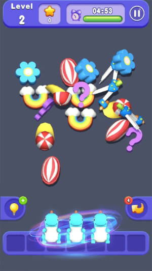 1、玩家需要在杂乱的3D物体堆中仔细观察,找出三个完全相同的物体进行匹配消除,逐步完成关卡目标。
