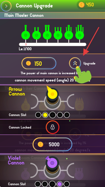 2、消耗150金币,点击【Upgrade】升级主炮台,提升威力与移动速度。