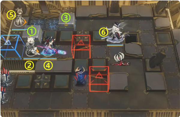 2、关卡部署:在如“殿堂”类地图,按编号1-6规划干员站位,利用深金惊蛰及其他干员技能、攻击范围,配合地形(红框阻挡区、蓝框增益区),阻挡并消灭敌人,推进关卡。