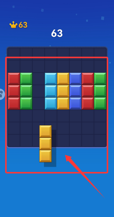 2、拖动下方方块到棋盘,使同色方块连成一行或一列,完成消除,消除后会新增方块继续挑战。
