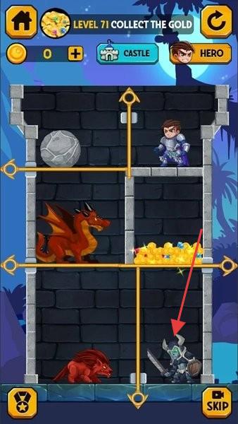 3、夺金关卡(LEVEL71),规划机关(横杆)操作顺序,避开恶龙、敌人,引导英雄取金币。