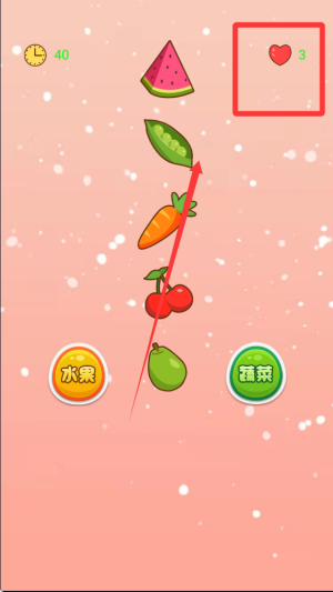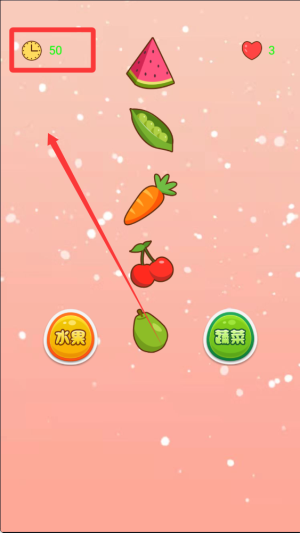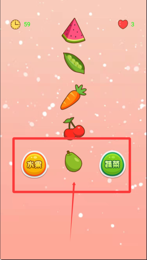 2、水果蔬菜会从屏幕上方不断降落,玩家需要在它们到达底部前快速点击正确的分类选项。