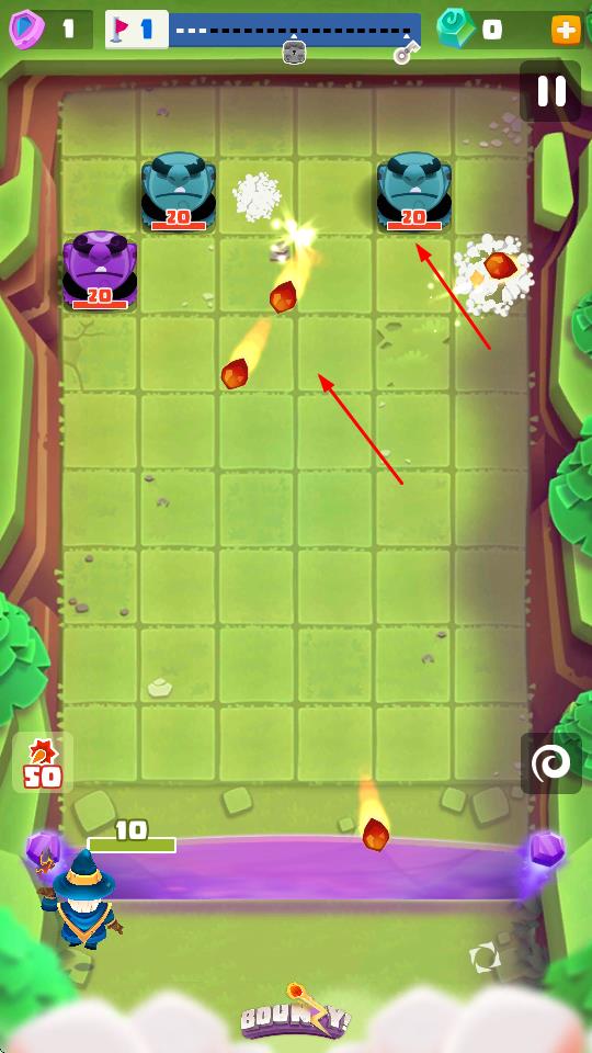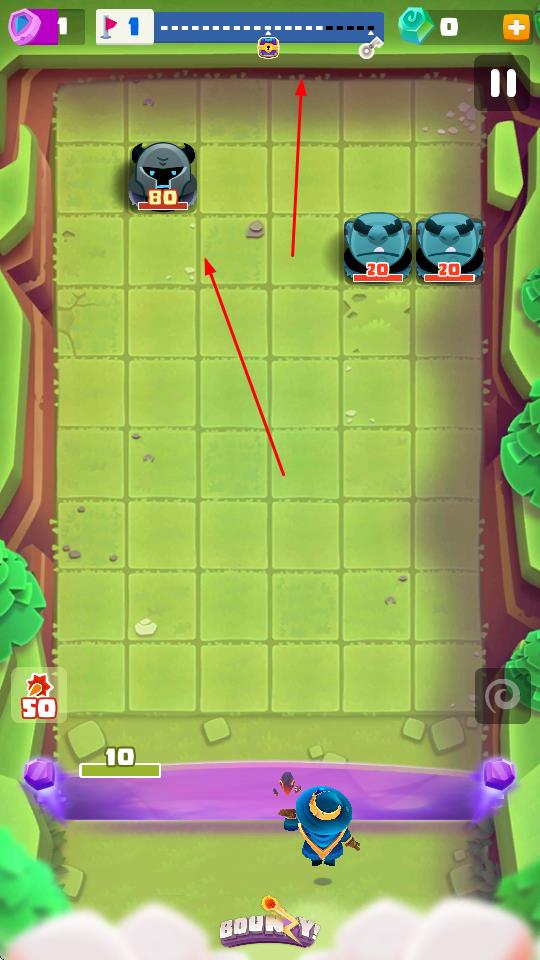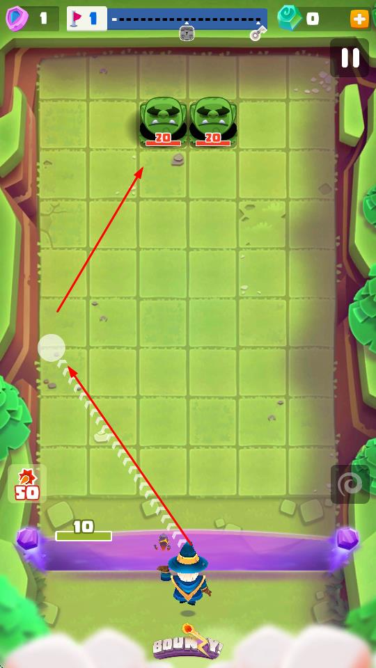 1、拖动巫师调整弹射角度,利用弹道反弹,精准攻击绿皮怪、蓝皮怪等敌人,消耗其血量。