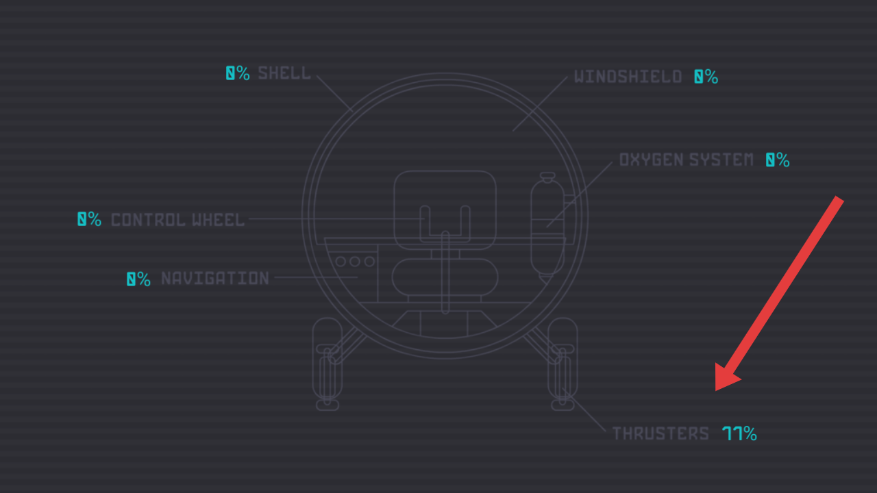 2、进入飞船建造界面,查看SHELL、NAVIGATION等部件进度,重点关注【THRUSTERS】71%的建造情况。