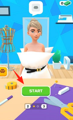 1、玩法机制扮演设计师,点击“START”为顾客量体,选择服装样式(如连衣裙)、图案颜色,通过缝纫机缝制衣物,完成订单。