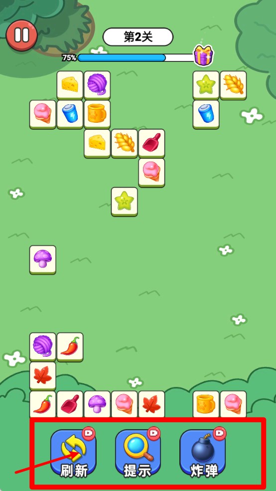1.游戏下方功能栏提供“刷新”“提示”“炸弹”等道具按钮,使用后可提升通关效率或打破卡顿局面。
