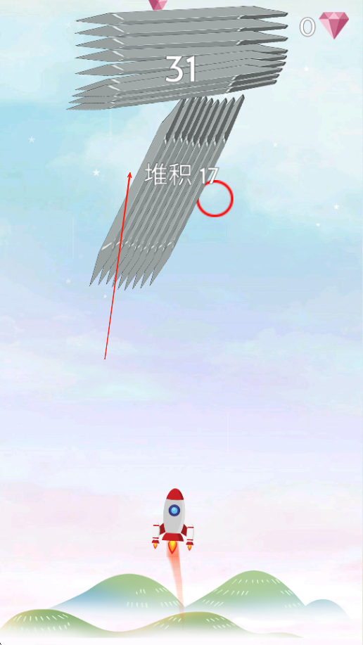 1、进入游戏后首先看到升空的火箭,通过滑动手指操控屏幕中的红圈小球,在火箭前方移动以清除首次出现的障碍物,熟悉基础操作流程。