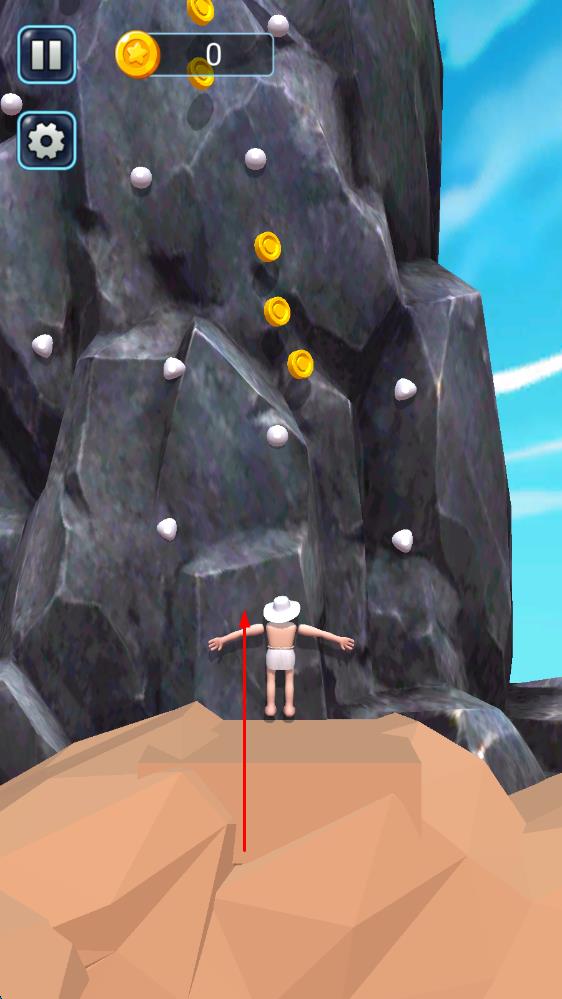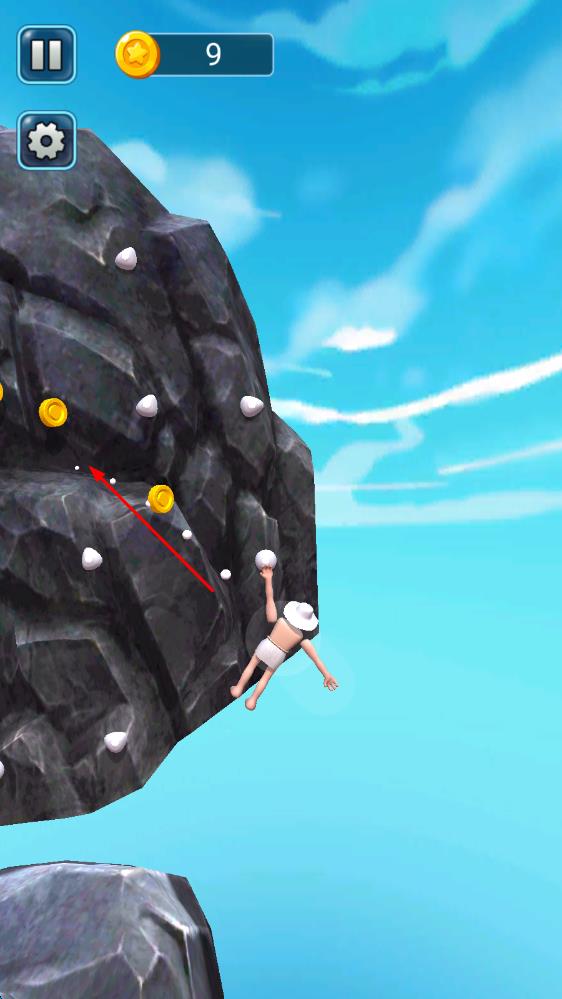 1、进入游戏,操纵冒险者站在悬崖底部,熟悉通过点击屏幕控制攀爬方向和速度的基本操作,准备迎接首次攀登挑战。