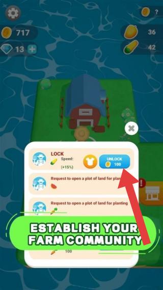 2、画面呈现农场相关界面,有“ESTABLISHYOURFARMCOMMUNITY(建立你的农场社区)”引导,还有解锁土地等功能选项,玩家可体验农场经营、社区建设等玩法。