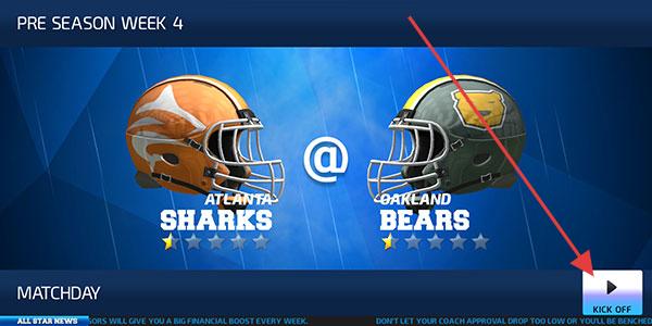 1、在赛季界面,确认第4周对阵信息,如亚特兰大鲨鱼队(ATLANTA SHARKS)对阵奥克兰熊队(OAKLAND BEARS),点击【KICK OFF】开启比赛。