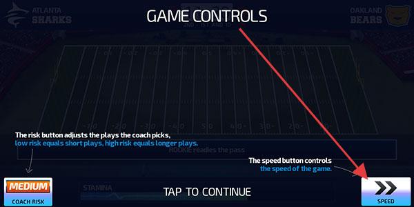 3、在游戏控制界面,了解【COACH RISK】按钮调整战术风险,点击【SPEED】按钮控制游戏速度,点击【TAP TO CONTINUE】继续游戏进程。