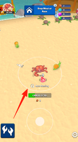 1、沙滩战斗,点击【箭头】指向螃蟹,自动攻击(Auto-Hunting),获取资源。