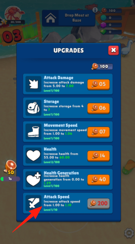 2、升级界面,用金币提升【箭头】所指“AttackSpeed”(攻击速度),增强战力。