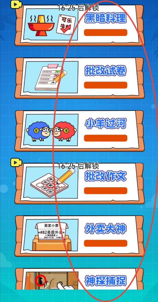 1、游戏主界面提供多种模式选项,包含试卷批改、渡河挑战及配送任务等,部分玩法需达到条件方能解锁体验。